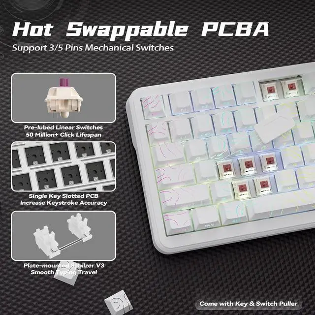 [Hot Swappable & Ergonomic Design] The hot-swappable sockets support linear blueberry switches (factory-lubed for smooth keystrokes) and 3/5-pin switches. Paired with OEM-height PBT keycaps (texture-resistant, no fading),it combines ergonomic familiarity with long-term durability and the adjustable tilt feet reduce wrist strain during long sessions.