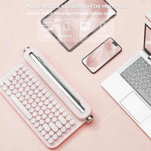 The B305 typewriter Bluetooth keyboard features the latest Bluetooth 5.0 technology, providing a stable and cable-free connection with a range of up to 33 feet (10 meters) without any delays. You can easily switch between up to three devices with the touch of a button, FN+1/2/3.