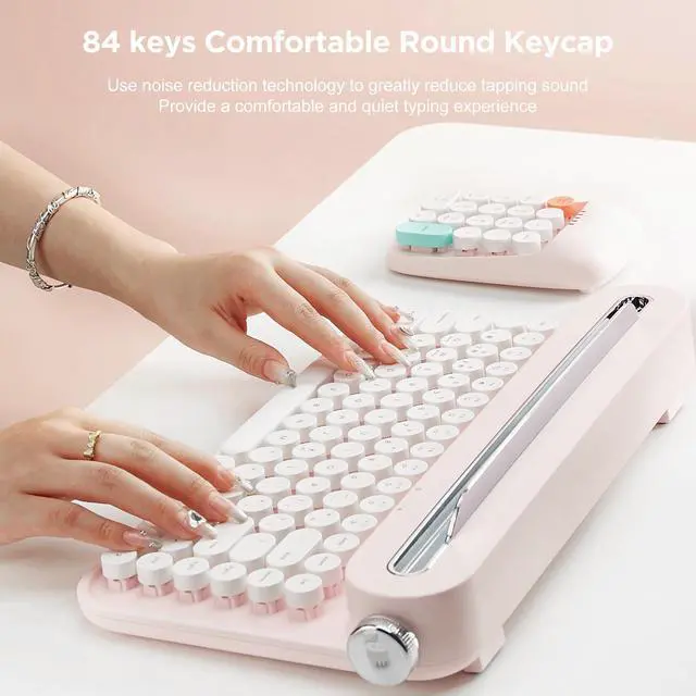 The YUNZII B305 wireless keyboard offers a unique blend of vintage charm and modern typewriter function. With its compact layout, retro keyboard style, pastel color scheme, and cute round keycaps, this eye-catching typewriter offers a more enjoyable typing experience.