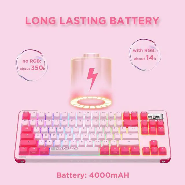 • The Y87 holds 87 key and 1 knob. It boasts both practical and compact features, while retaining minimalist layout and a knob for switching the wireless and wired connection modes.The N-key rollover (NKRO) on wired and wireless modes make the Y68 fit office home and light gaming use while connecting with your smartphone, laptop and PC.Build-in battery has 4000 mAh that can last up to 350 hours.