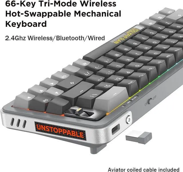 The Y68 holds 66 key and 1 knob. It boasts both practical and compact features, while retaining minimalist layout and a knob for switching the wireless and wired connection modes.The N-key rollover (NKRO) on wired and wireless modes make the Y68 fit office home and light gaming use while connecting with your smartphone, laptop and PC.Build-in battery has 3000 mAh that can last up to 350 hours.