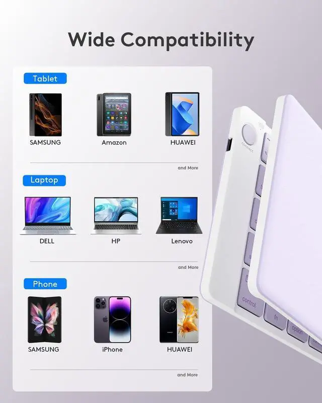 The Bluetooth keyboard works seamlessly with OS, iOS, Android and Windows. Maintain a stable connection and provides fast response to devices within 10 meters of operation. Compatible with a variety of devices, including Apple iPad Air, iPad 4/3/2, iPad Mini 4, iPhone 15/14/13/12/11, etc., Galaxy Tab, Galaxy Note, Surface Pro, Amazon Kindle, and other Bluetooth devices.