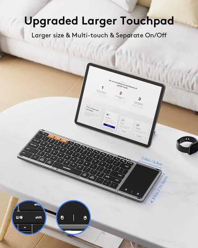 portable folding keyboard, only 9.3 ounces. Palm-sized keyboard can be folded up magnetically and put in your briefcase without taking up much space. Maximum convenience for you with minimum weight and size! Comes with a Phone stand and a velvet storage bag, the perfect companion for a folding keyboard. Not just a keyboard, but a travel solution!