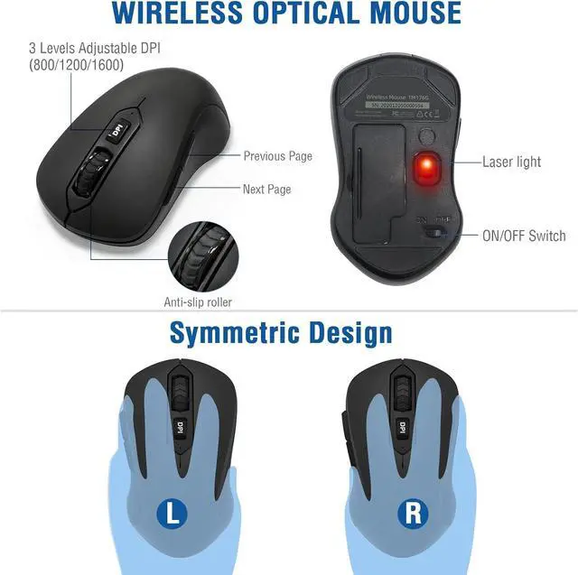 The mouse was optical design, even on some smooth surfaces, precise control can be obtained. 3-level adjustable DPI (800/1200/1600) allows you to choose your favorite moving speed of cursor. In addition, this wireless mouse is symmetry design, no matter you are Right handed Left handed, both hands are available, suitable for all people.