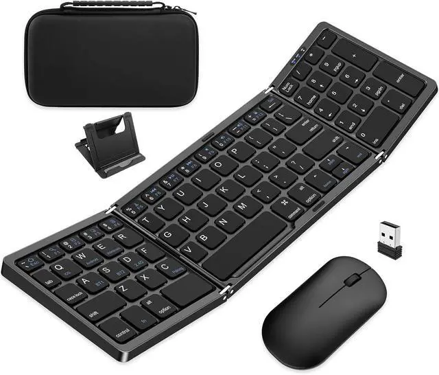2.4G Wireless & Bluetooth Keyboard MouseFeaturing both Bluetooth and wireless connectivity, this foldable wireless keyboard mouse combo effortlessly connects with up to 3 devices (BT1+BT2+2.4G). Keyboard mouse wireless Bluetooth maintains a stable connection within a 33ft (10m) range, allowing seamless switching between devices. Widely compatible with Windows, Android, iOS, and Mac systems, works smoothly on laptops, desktops, tablets, Android devices, and more.