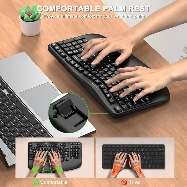 WAVE-SHAPED KEYS DESIGN: This wireless ergonomic keyboard with innovative and unique wave design perfectly fits the natural curve of the human hand, so that the fingers can stretch naturally during the typing process, reducing hand fatigue and discomfort