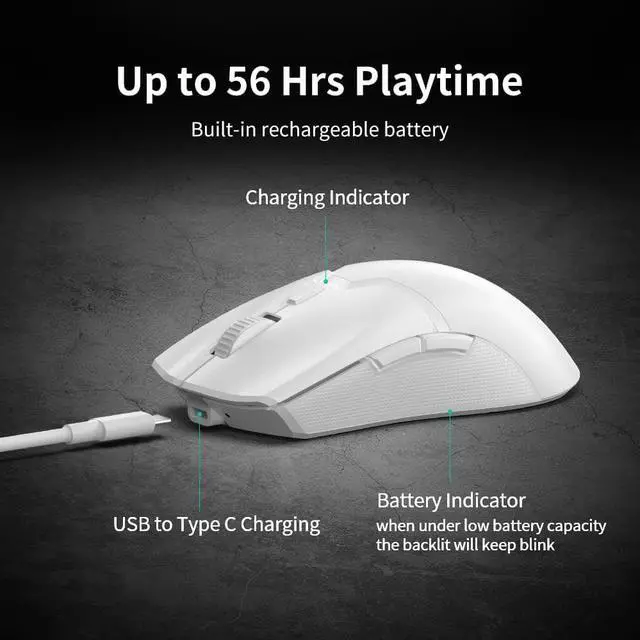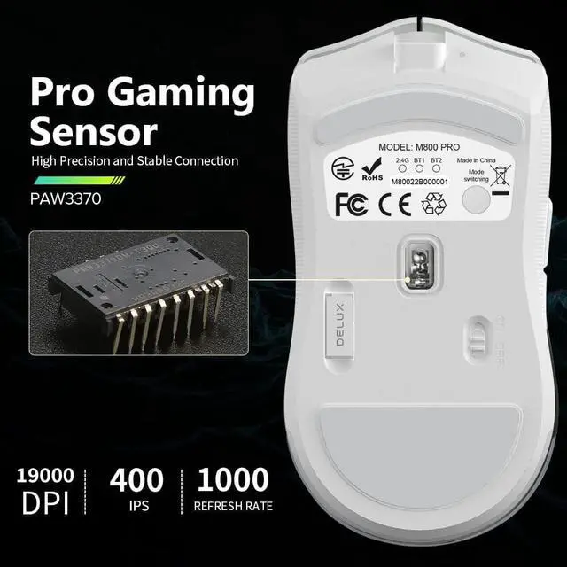 [High-end Wireless Solution] PAW3370 High precision optical tracking with 5 gear DPI(default: 800/1600/3200/8000/19000, support 50-19000DPI setting via driver), 400IPS, 50g ACC and 1000 Refresh Rate