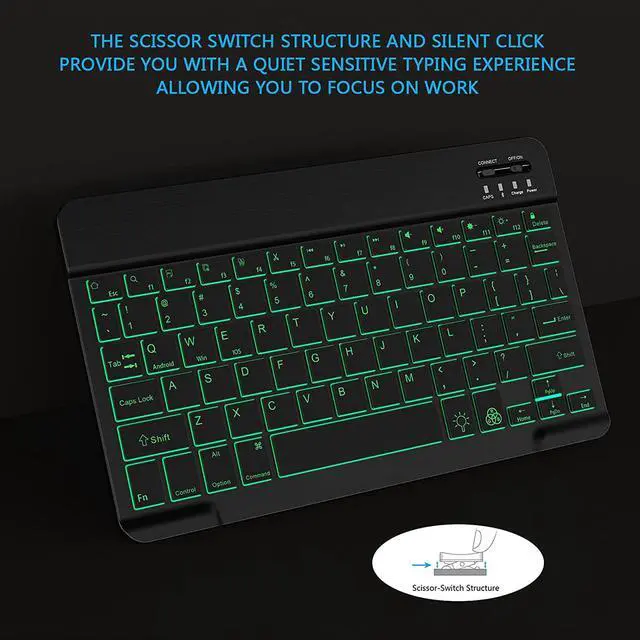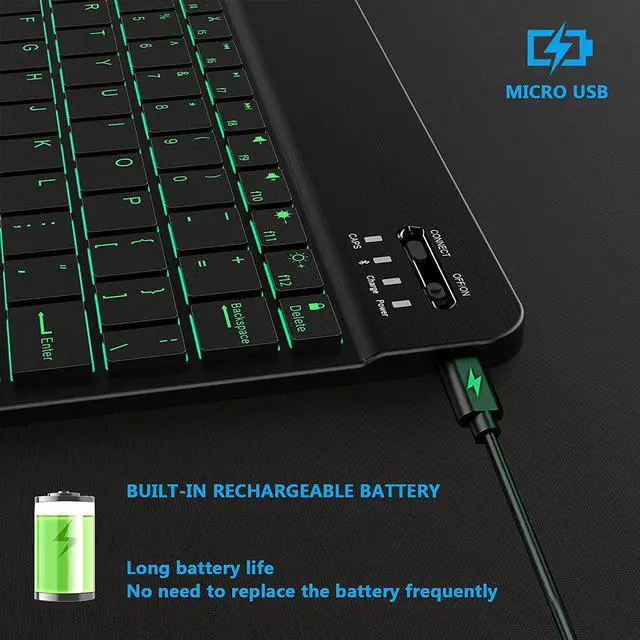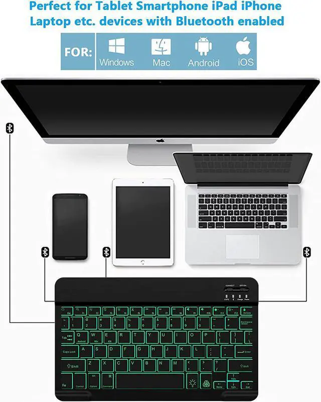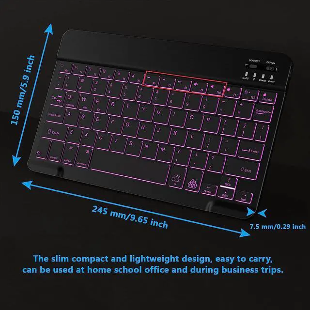 LED Backlit: This Bluetooth keyboard has a 7 colors backlight mode. Even in the dark, it makes your typing more easily and conveniently. You can switch colors among red, yellow, purple, green, ice blue, blue, and white by pressing the RGB key. When the keyboard is idle, the light will automatically turn off to save power.