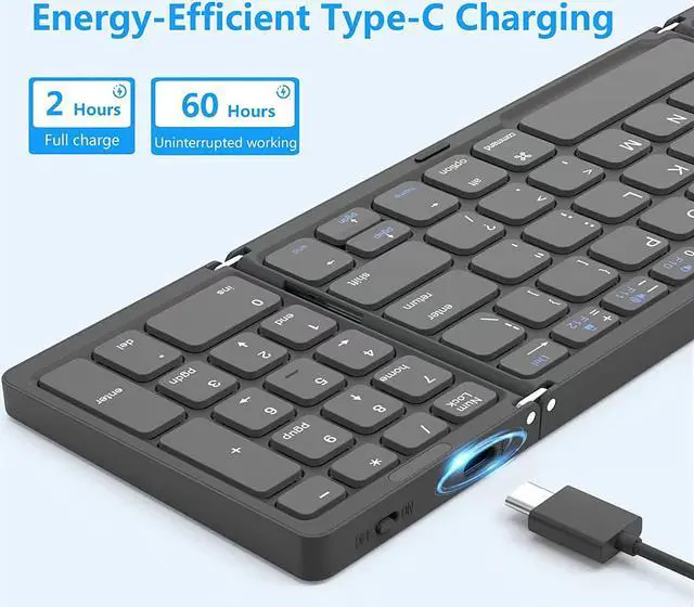 Folding Keyboard with Numeric KeypadUpgrade equipped with numeric keyboard to facilitate quick calculation and numeric input. Update richer and more practical multimedia shortcut functions to make your work more convenient and efficient! Upgrade Tpye-C fast charge, only 2 hours charging can work 60 hours or standby 560 hours. A full charge is enough for your short business trip or vacation.