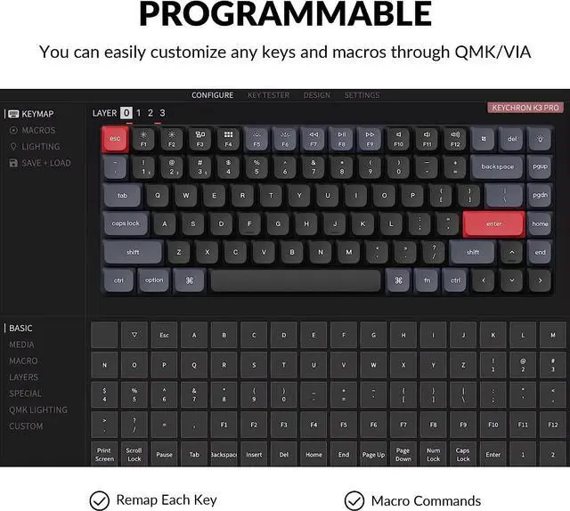 With QMK and VIA Support: Keychron K3 Pro allows anyone to remap any key, and create macro commands, shortcuts, or combination keys through VIA. Simply connect the K3 Pro to your device with a cable, drag and drop your favorite keys or macro commands to remap any key you want on any system (macOS, Windows, or Linux).