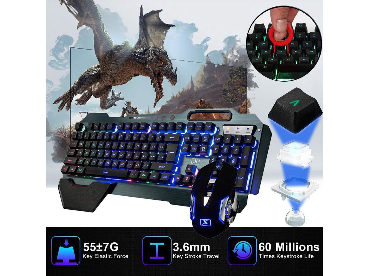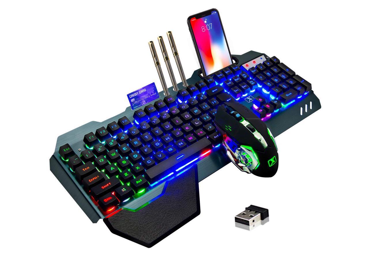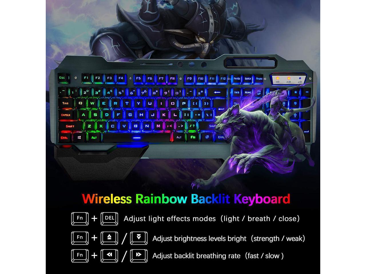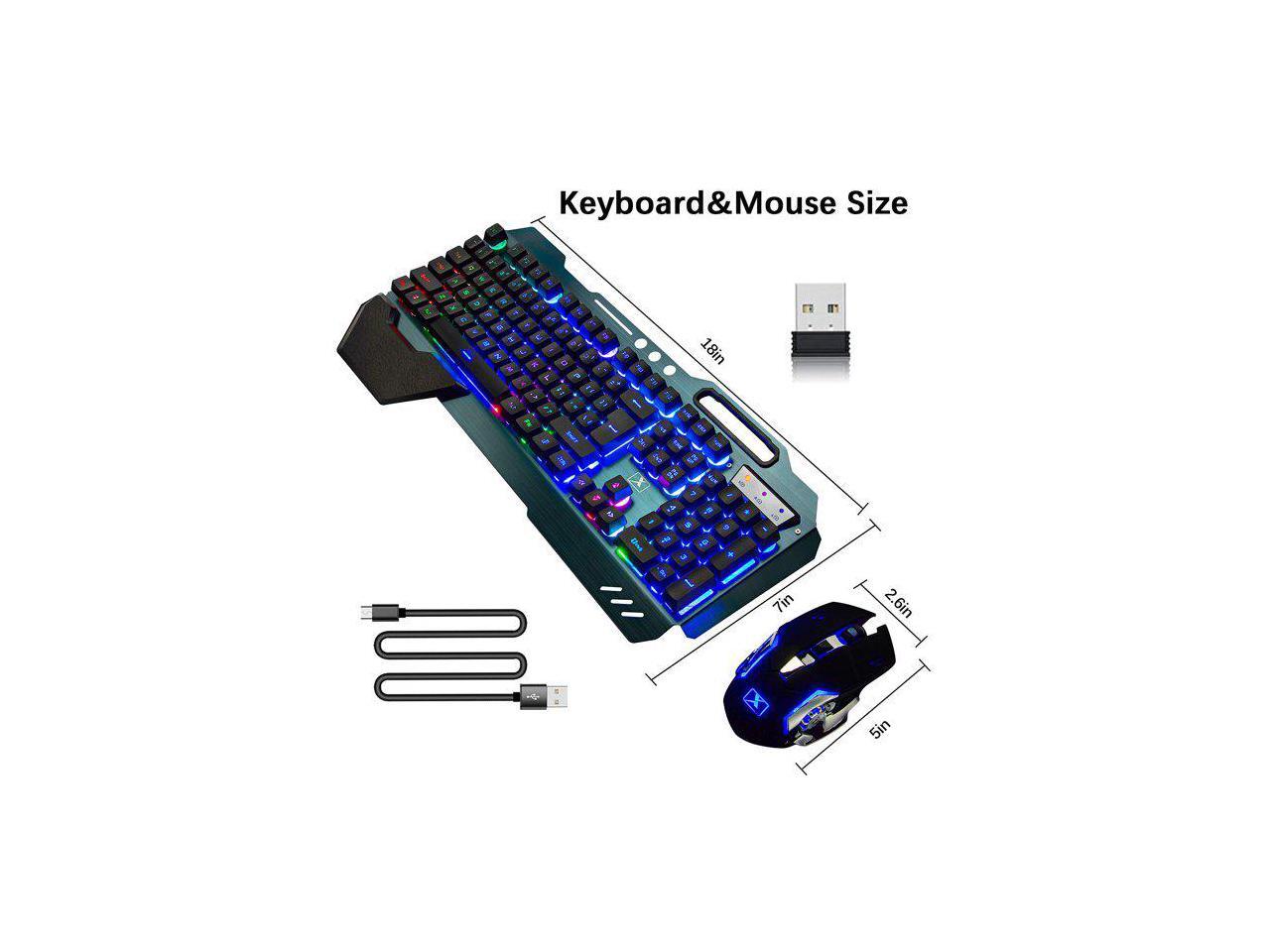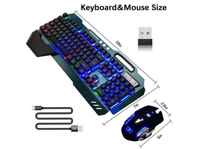 Wireless Gaming Keyboard and Mouse,Rainbow Backlit Rechargeable Keyboard Mouse with 3800mAh Battery Metal Panel,Removable Hand Rest Mechanical Feel Keyboard and 7 Color Gaming Mute Mouse for PC Gamers