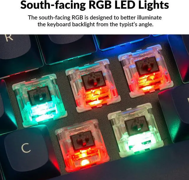 The south-facing RGB is designed to better illuminate the keyboard backlight from the typists angle with the premium non-shine-through PBT keycaps installed. The PBT keycaps will provide excellent oil resistance, enhance the type feel, and prevent the legends from fading out.