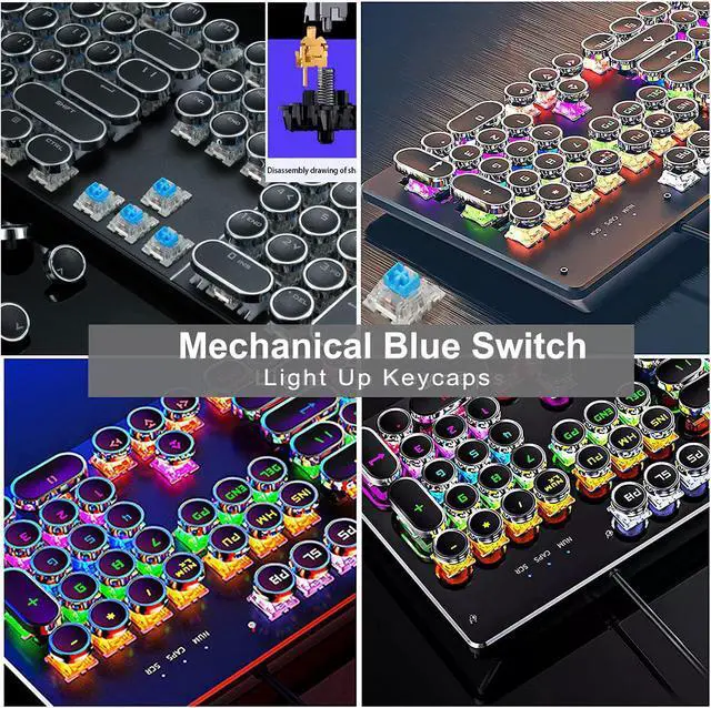 Mechanical Blue Switch Gaming Keyboard- Mechanical Blue Switch Gaming Keyboard (Cherry Blue Equivalent) for ultimate gaming performance. Retro keycap looks like a classical typewriter, brings you comfortable typing feeling & stable clicking touch. The Mechanical Keyboard Keys offer medium resistance, audible Click Sound & Tactile Feedback. Sensitive and Responsive. Easy to press and fast response.