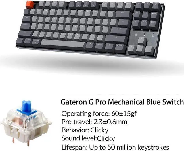 Features durable Gateron mechanical switches available in Blue (clicky), Brown (tactile) and Red (smooth linear) to meet your typing preference.