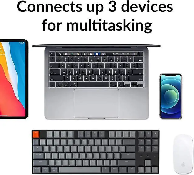 White LED Backlighting - allows for crisp visibility and includes 15+ backlighting effects. Connect up to 3 Bluetooth devices and switch seemlessly between them, or connect in wired mode via USB-C connection. Long lasting 4000mAh battery provides up to 4 weeks of wireless power with backlights disabled.