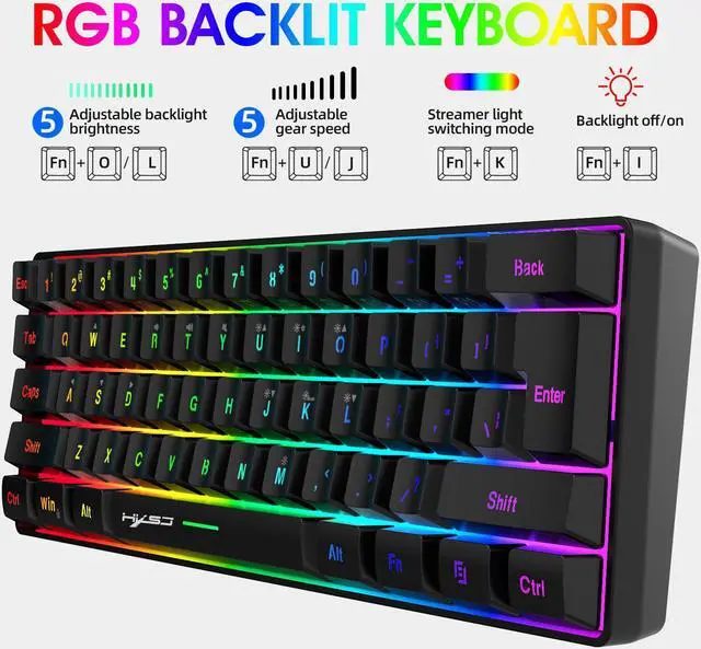 The 60 percent keyboard has a perfect size and it's good for HomeOfficeBusiness or Travel use. You know, keyboard without number is most FPS gamers choice, more spaces left for mouse movements. The bottom of the 61 response key cap is of silicone structure, and the key cap are sprayed with oil radium carving, which makes it feel skin-like and more comfortable. Using advanced imitation mechanical technology, one of the attractive features is the mechanical feeling.