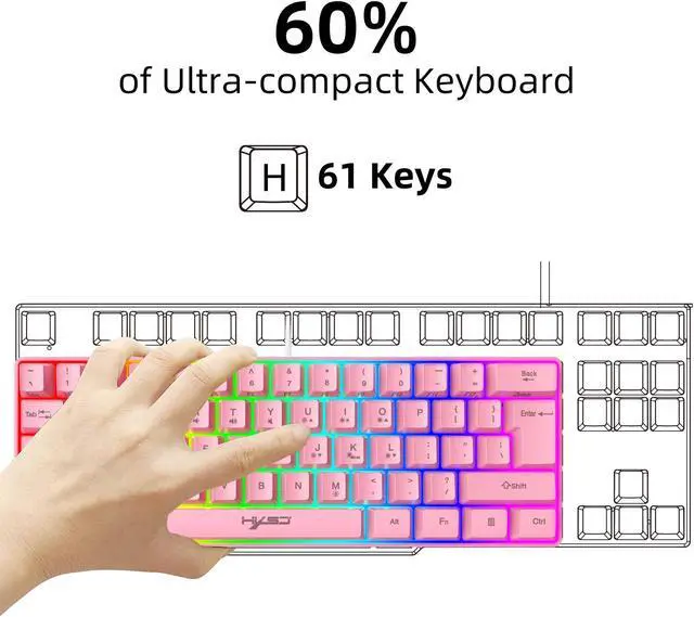 The 60 percent keyboard has a perfect size and it's good for HomeOfficeBusiness or Travel use. You know, keyboard without number is most FPS gamers choice, more spaces left for mouse movements. The bottom of the 61 response key cap is of silicone structure, and the key cap are sprayed with oil radium carving, which makes it feel skin-like and more comfortable. Using advanced imitation mechanical technology, one of the attractive features is the mechanical feeling.