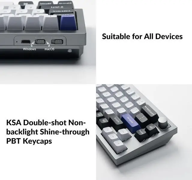 South-Facing RGB: Comes with 22 types of RGB backlight settings. You can further fine-tune the RGB hue, saturation, brightness, effect speed, and different modes, or even remap these keys with QMK/VIA. Designed our unique Keychron spherical-angle (KSA profile) double-shot keycap set with premium non-backlight shine through PBT material, that is oil-resistant and durable for long-term use.