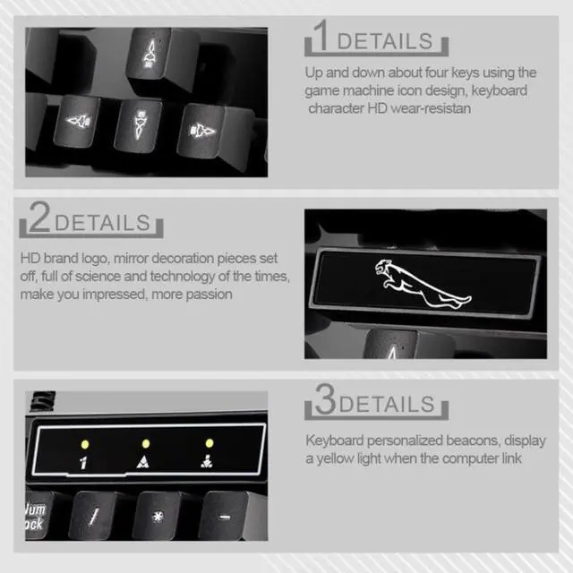 1. Suspension style key caps, dust-proof, easy to take down to clean thoroughly for longer work time 2. Wired gaming keyboard mechanical hand feel 3. The laser carving characters do not fade 4. HD UV characters 5. Compatible with notebook computers, desktop computers, smart TV etc.