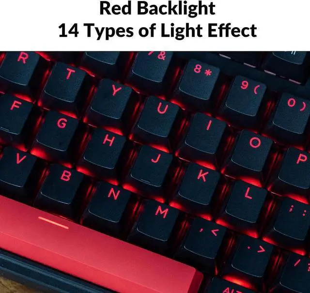 Shine-through double-shot ABS keycaps: Made through the ABS double-shot process, the keycaps are durable and wear-resistant. Meanwhile, the shine-through legends lit up by the north-facing LED present a glamorous look at your fingertips. And you can also switch from more than 14 types of red backlights.
