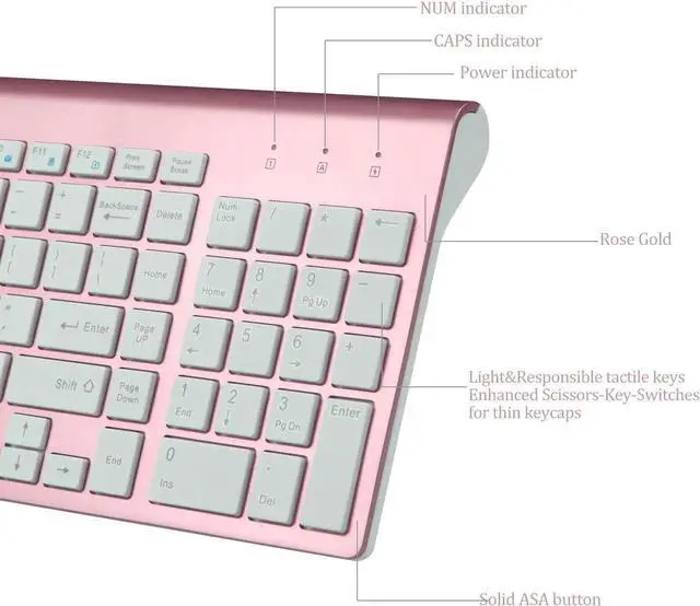 Both of the keyboard and mouse are ultra slim, the thinnest part of the keyboard is just 0.24 inch, the mouse is 1.2 inch. Very responsive keys in scissor-key-switches. Angled tilt provide support.