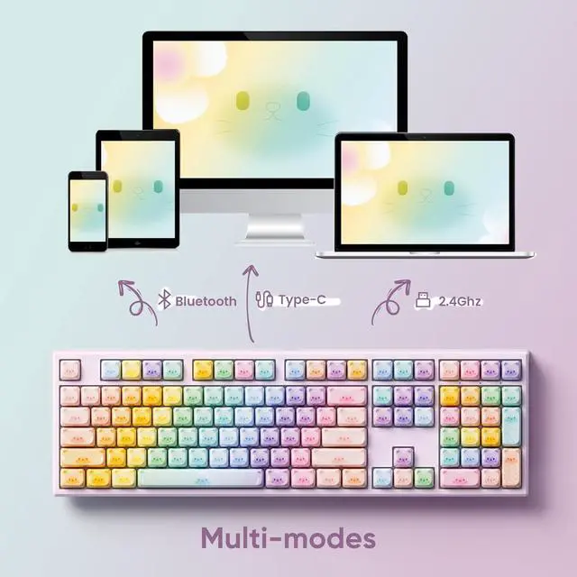 Multi-device & Wireless: MG108B mechanical keyboard can be connected to multiple devices through Bluetooth 5.0, Multi-host 2.4Ghz (with a receiver), and wired Type-C mode with easy switch
