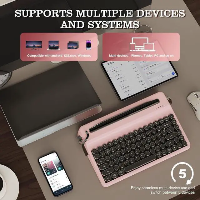 Wireless Typewriter Keyboard: QL75 wireless typewriter keyboard offers seamless keyboard wireless connectivity via USB-C, Bluetooth, and 2.4GH z wireless, compatible with Windows, macOS, and Android for versatile use. Enjoy seamless multi-device use and switch between 5 devices for tablet or smartphone, pc, tv, and etc. This build-in large battery capacity ensures that the gaming keyboard is always ready for long work or typing.