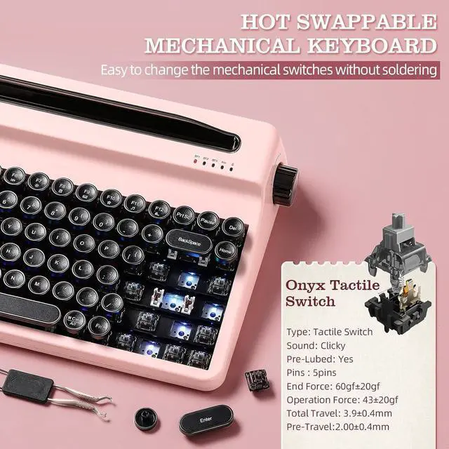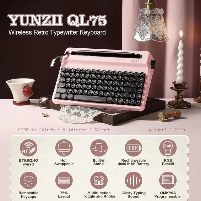 Retro Typewriter Keyboard: YUNZII QL75 retro keyboard features a unique typewriter style keyboard aesthetic with tri-mode connectivity ( BT/ 2.4 gHz wireless/ wired) and build-in stand for multiple devices. Each key row of this mechanical keyboard has a gradually ascending height for an ergonomic and comfortable typing experience. With the keyboard typewriter style design, round keycaps and pre-lubed switches, the wireless keyboard is perfect for lovers of retro keyboard and typewriter style aesthetics.