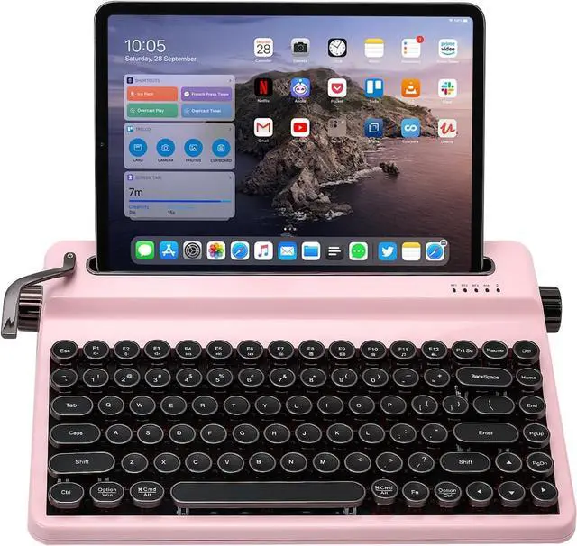 • Retro Typewriter Keyboard: YUNZII QL75 retro keyboard features a unique typewriter style keyboard aesthetic with tri-mode connectivity ( BT/2.4gHz wireless/ wired) and build-in stand for multiple devices. Each key row of this mechanical keyboard has a gradually ascending height for an ergonomic and comfortable typing experience. With the keyboard typewriter style design, round keycaps and pre-lubed switches, the wireless keyboard is perfect for lovers of retro keyboard and typewriter style aesthetics.