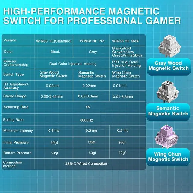 Hall Effect Keyboard with Magnetic Switch: Equipped with advanced hall effect magnetic switches, the WIN68 HE MAX gaming keyboard offers adjustable actuation point( 0.01 mm- 3.3 mm), and each key can be personalized to the smallest unit of 0.1 mm, providing an ultra-precise keying experience. In addition, press/reset sensitivity can be individually set via software to match the keystroke habits of different people in different types of games