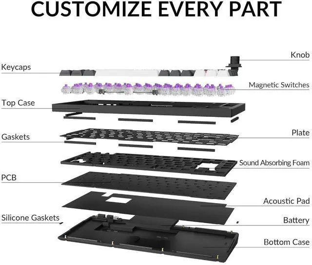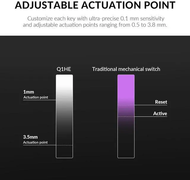 Hall Effect Gateron Double-rail Magnetic Switch: With the first invented dual-rail structure, these pre-lubed magnetic switches come with a sensitivity of only 0.1 mm, it offers more precious feedback. You can customize actuation points (0.5 to 3.8 mm) and assign multiple actions to a single key based on the travel depth you want, enhancing gameplay and a customizable typing sensation (Compatible with Gateron Double-rail Magnetic Switches only)