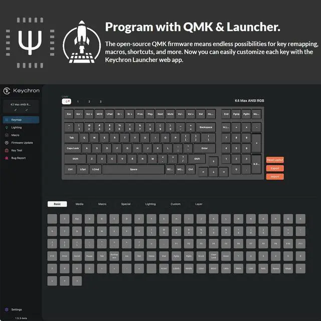 Program with QMK & Launcher - The open-source QMK firmware means endless possibilities for key remapping, macros, shortcuts, and more. Now you can easily customize each key with the Keychron Launcher web app. N-Key Rollover (NKRO) for both wireless and wired modes.