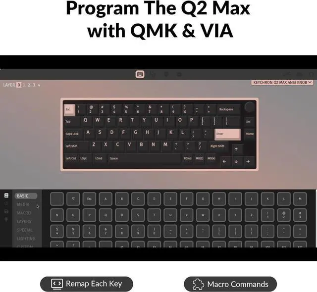 Program any key with QMK/VIA - QMK / VIA is open-source software for keyboards that allows anyone to easily program and remap each key or macro (incl. the knob) on macOS, Windows, or Linux. Please download the appropriate keymap JSON file, open VIA, turn on "Show Design tab" on "Settings" tab, and drag the JSON file into the Design tab on VIA to get the Q2 Max keymap working on VIA.