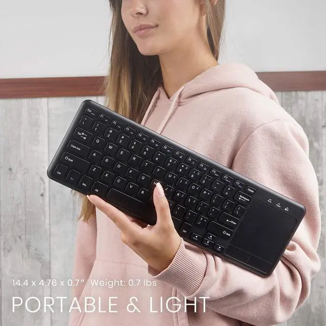 ALL-IN-ONE: Compact size keyboard with a large touchpad that is ideal for a laptop, PC, or smart TV navigation in the living room with multi-touch feature; Available gestures: pointing, zooming, and scrolling function