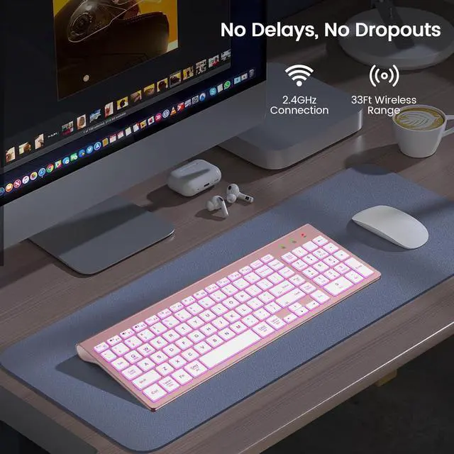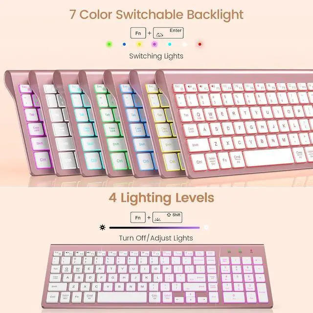 • 7 SWITCHABLE COLORS BACKLIGHT: This wireless keyboard boasts 7 customizable backlight colors and 3 brightness levels, providing clear visibility in dim settings. Personalize your lighting to enhance your typing atmosphere with both comfort and style