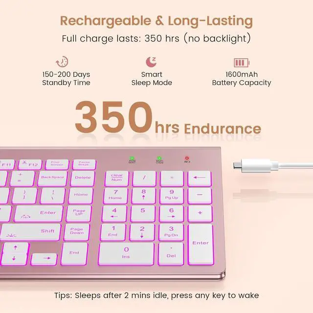 RECHARGEABLE & POWER-SAVING: Equipped with a 1600mAh rechargeable battery, this computer keyboard offers up to 350 hours of use without the backlight. Its ON/OFF switch and auto-sleep mode intelligently conserves energy