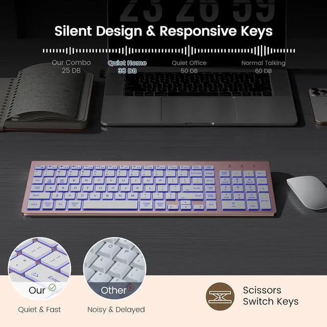 QUIET AND COMFORTABLE TYPING: The silent light-up scissor switch keys minimize typing noise by up to 95%, providing a laptop-like typing experience. The built-in 7°tilt angle and responsive keystrokes ensure comfort and efficiency