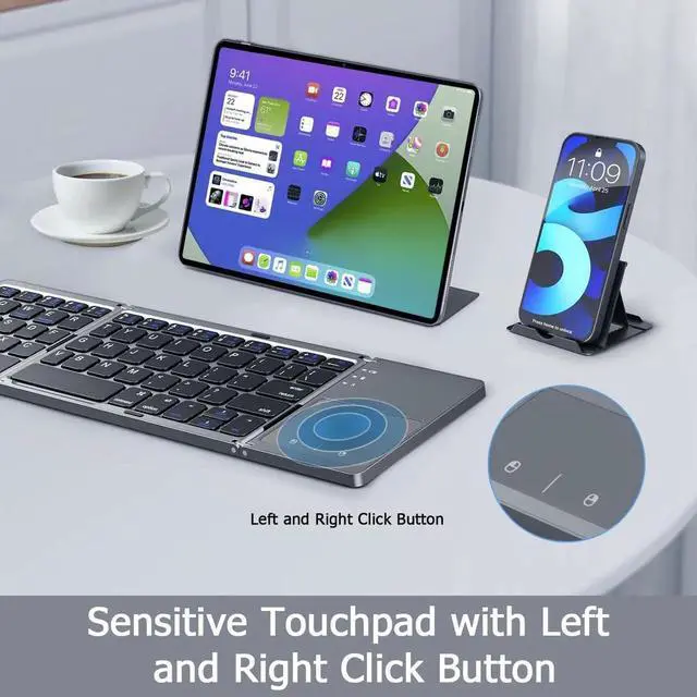 KUNSI Foldable Bluetooth Keyboard with Touchpad, Portable Wireless Keyboard with USB-C Rechargeable, Pocket Size Slim Folding with Phone Holder for iPads Tablets Laptop-Dark Gray