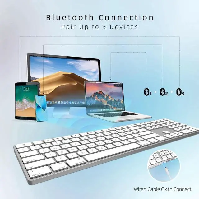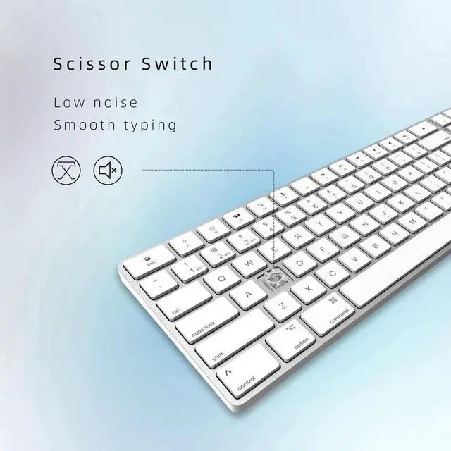 Bluetooth Slim Keyboard for Mac, Aluminum Rechargeable Keyboard Wireless, Low-Profile Silent Flat Key Compatible with Apple iMac, MacBook, Mac and iOS, Full Size - Silver White