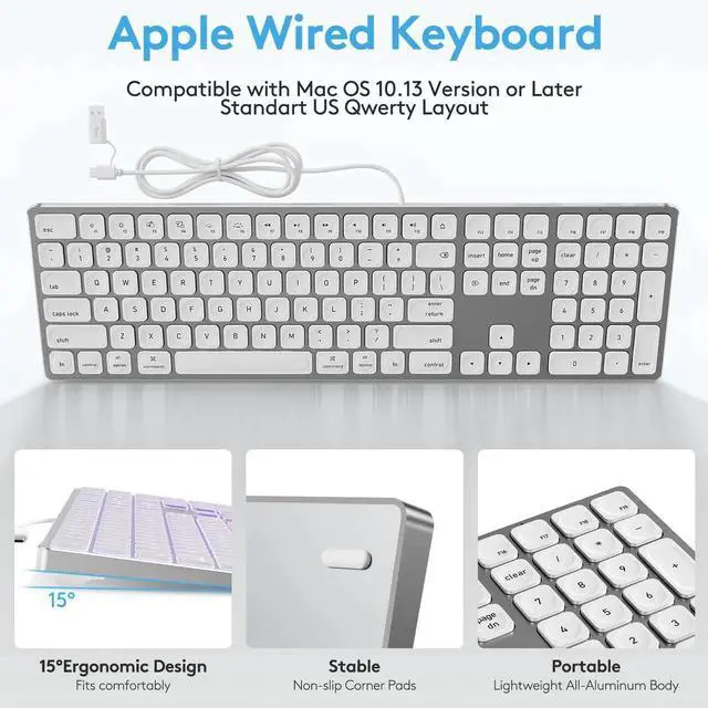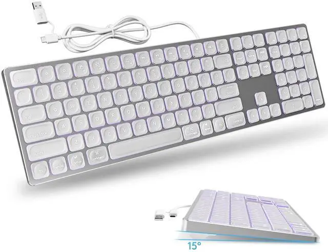 White Aluminum Backlit Keyboard for Apple Mac OS, Plug-N-Play, USB-A/USB-C Wired Keyboard with Numeric Keypad for iMac/Mac mini or MacBook Laptop