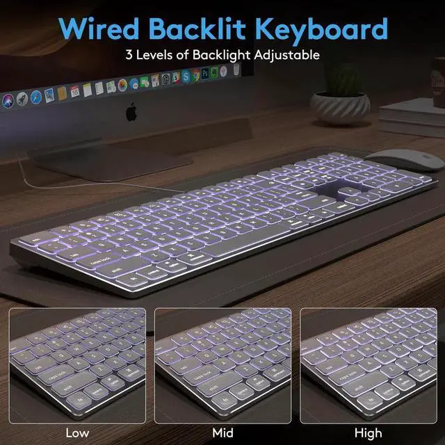Wired Backlit Keyboard. Each key can be illuminated from below, enhancing typing enjoyment in dark or dim environments. With three adjustable brightness levels (Low, Medium, High), you can easily control the lighting using the two top-row buttons.