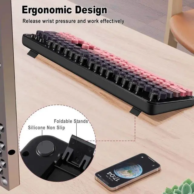 Kootop Wireless Keyboard and Mouse Combo, Cute Colorful 104 Keys Typewriter Retro Round Keycaps Keyboard for PC Laptop, Desktop, Windows, Home and Office Keyboards (Black Pink)