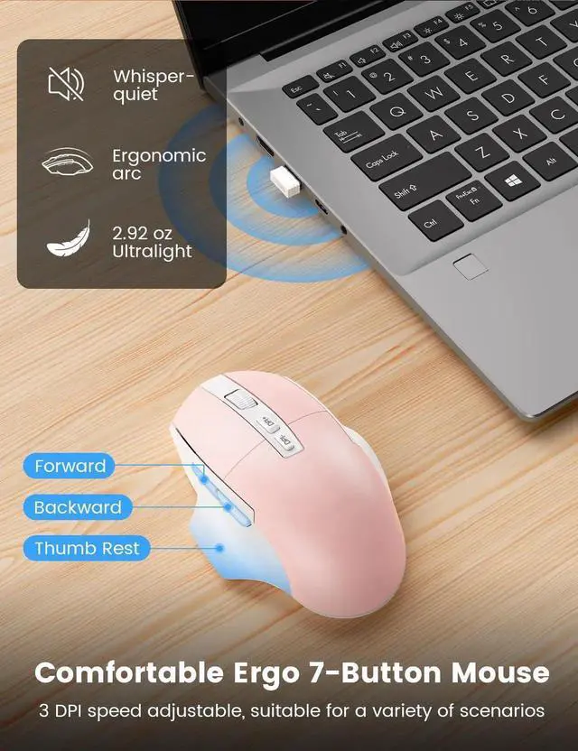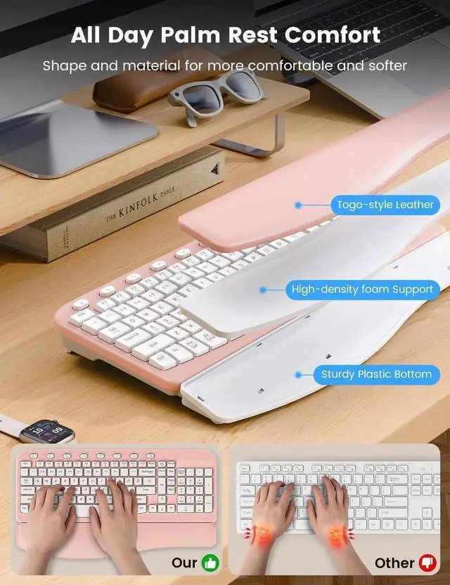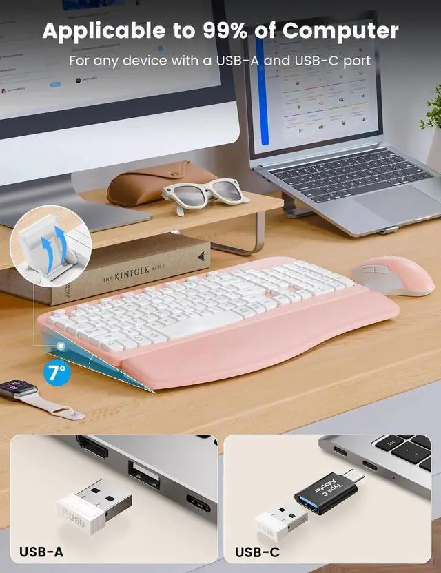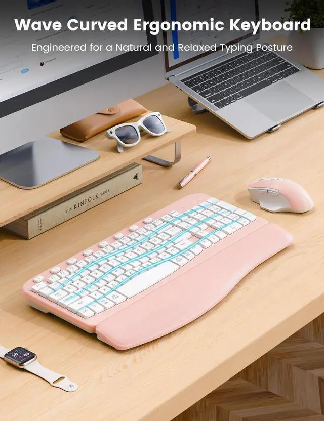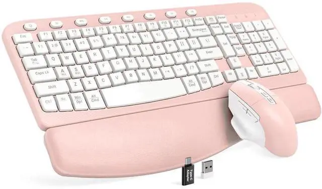 SABLUTE Wireless Keyboard and Mouse Combo, Ergonomic Wave Keys, Cushioned Plam Rest, Comfortable Silent Natural Typing, 2.4G Lag-Free, Full Size Keyboards Cordless Set for Multi-OS, Windows/Mac, Pink