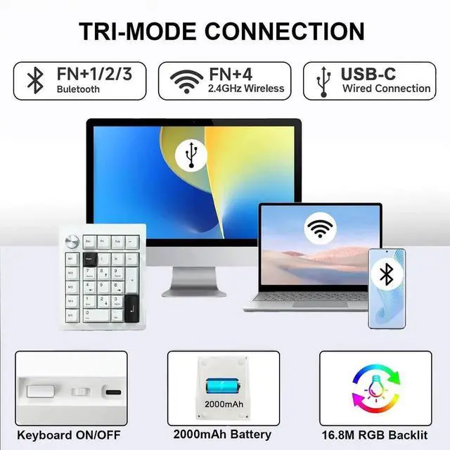 GMK26 Mechanical Numpad, QMK/VIA Macro Keypad BT 5.0 / 2.4 ghz/Type C Wireless Number Pad RGB HotSwap Numeric Keypads with Knob, PBT Keycaps Gasket Rechargeable Number Keypad for PC Laptop Desktop (White)