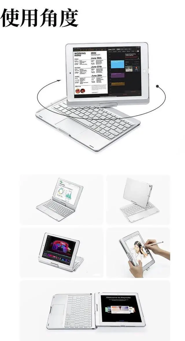 360 ° rotatable This backlight keyboard case supports 360° rotation, allowing you to easily adjust to the most comfortable angle for you. Very suitable for work, business, school, travel and home, working, writing, and watching videos.