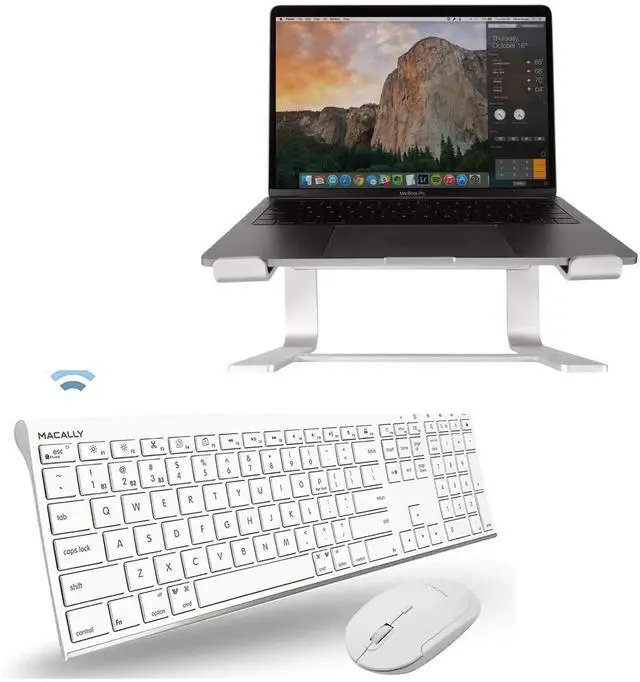 A wireless bluetooth multisync keyboard for Mac and PC, that comes with a wireless mouse and a sleek laptop stand. Ultimate working bundle.