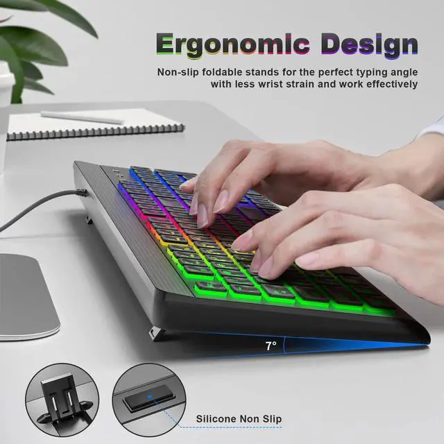 This computer keyboard features a scientific ergonomic typing angle (7°) stand on the back, maximizing hand comfort during extended work sessions. It also provides the anti-slip rubber feet to make the keyboard more stable.