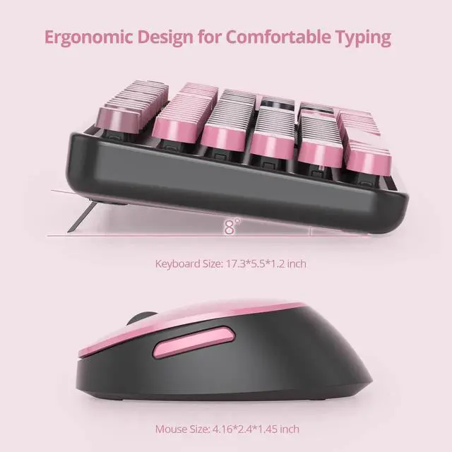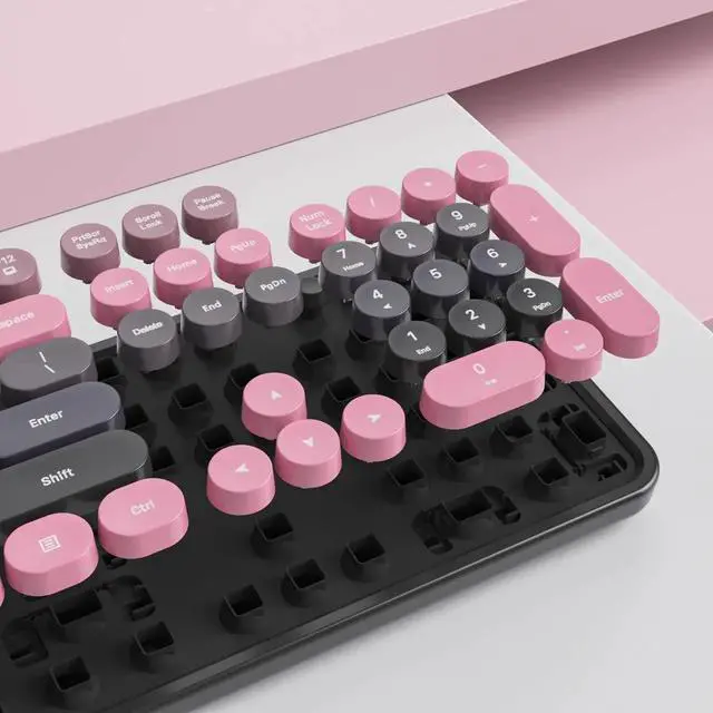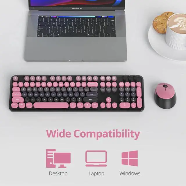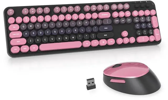 Guffercty kred Black and Pink Keyboard and Mouse Wireless, Retro Typewriter Cute Colorful Wireless Keyboard Full-Size 2.4GH z with Round Keycaps for Desktop Laptop and PC (Pink Plum)
