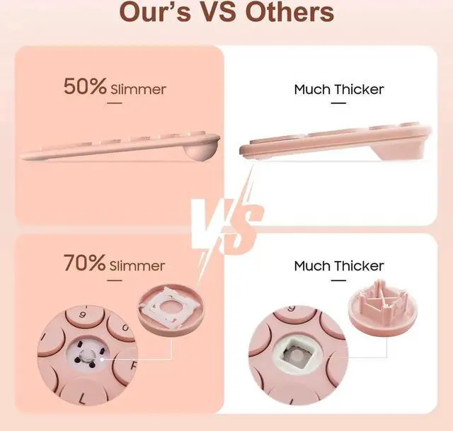 ULTRA-SLIM AESTHETIC KEYBOARD ABS material used, the cordless keyboard and mouse combo is not only of a cute retro keyboard wireless style, but also unexpectedly lightweight, making it easy to carry on the go. The thinnest part is 0.4cm.