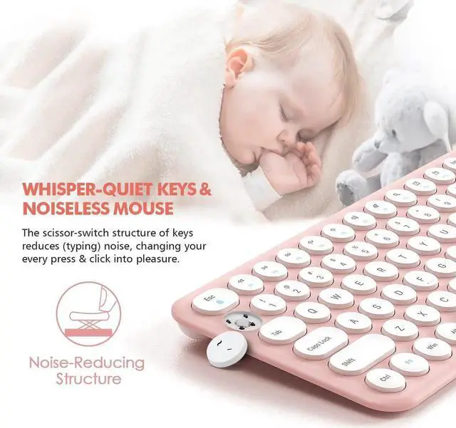 QUIET KEYBOARD MOUSE SETNoise-reduced scissor-cross Cute Round-Key best suit working in a quiet environment. Also, you will fall in love with the smooth touch of the optical mouse and the matte-like surface of each key.